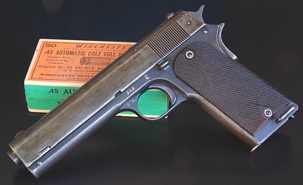 Model 1907 Military Serial Number 145 - 200 .45 cal. No. 1 -200 (inclusive) Modified hammer, Nearly vertical ejection. Auto Indicator to show that chamber is loaded, Auto safety, Strengthened stirrup, and Lengthened trigger stirrup pin. Shipped   to the U.S. Government, Springfield Armory, March 17, 1908.