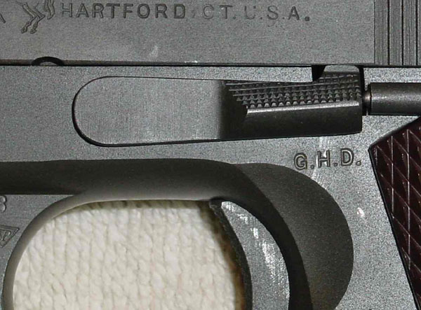 G.H.D. ordnance mark below slide stop for Brig. General Guy H. Drewry, Springfield Ordnance District, Army Inspector of Ordnance, June 17, 1942 to July 15, 1945.