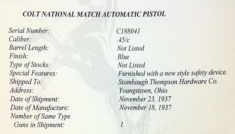 Colt National Match Serial Number C188041 -This National Match was furnished with a new safety device (Swartz Safety), manufactured on November 18, 1937 and was a single gun shipment to Stambaugh Thompson Hardware Co., Youngstown, Ohio on November 23, 1937.